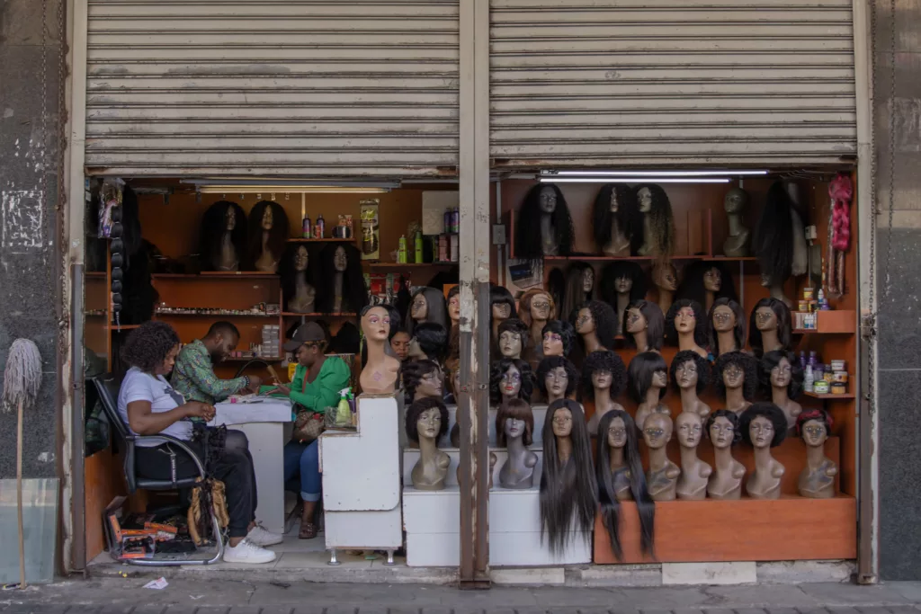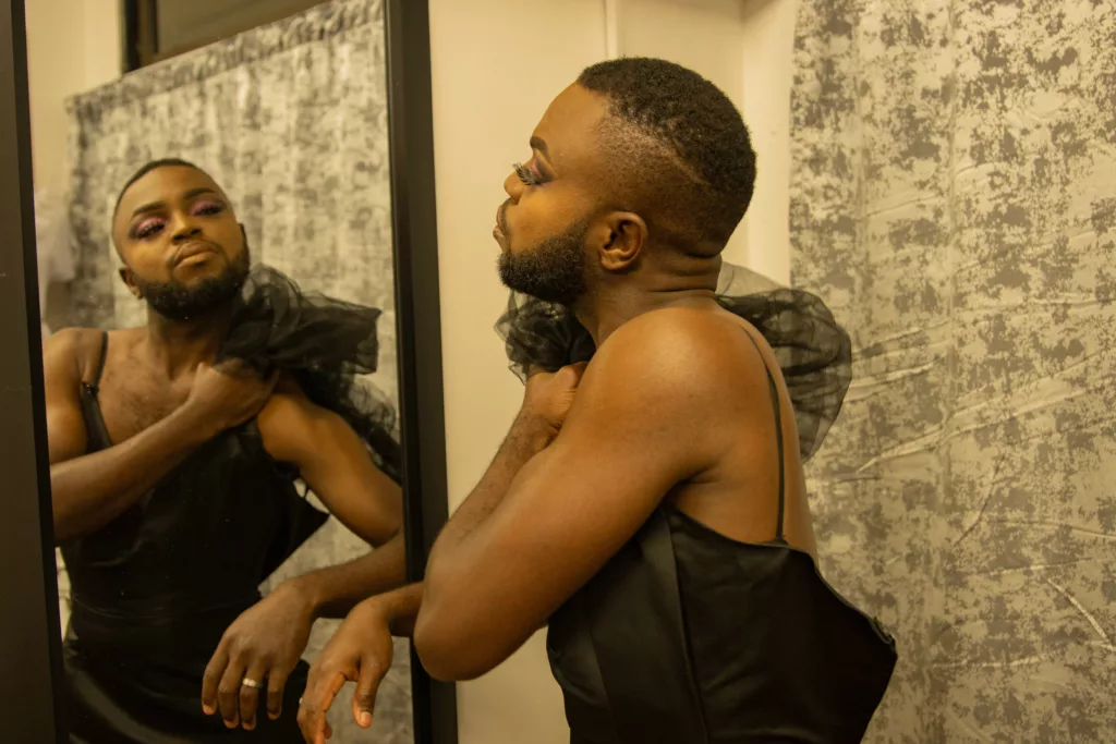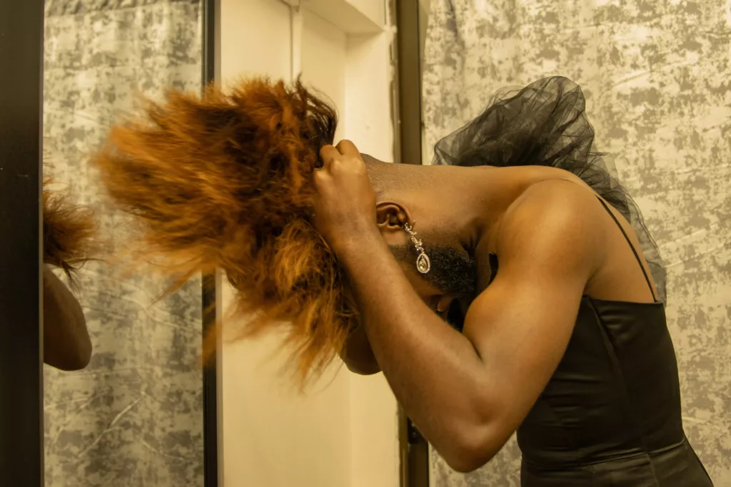 Imhaku Peters, at work in his beauty salon in Newtown, Johannesburg. An openly gay man, Peters left his country of origin, Nigeria – where same-sex relations could lead to the death penalty – in search of a better life in South Africa. “It was not very safe,” he says, of life in his home country. “It is easier and safer to be here in South Africa, because it is legal.A display of wigs for sale at Peters’ store. “I love my job, generally,” he says. “I breathe my job. It’s my every day and it’s what puts food on the table.”Peters is a regular participant in ballroom events, such as Vogue Nights Jozi, and also has his own “little drag show”, The Legendary Ball Joburg.“A lot of people do not expect you, as a man – especially as an African man from Nigeria – to wear makeup or put on a dress or wear a wig,” he says, adding: “I feel very inspired and very strong when I do the things which people do not expect of me.Despite South Africa’s reputation as a ‘safe haven’ for queer persons on the continent fleeing persecution in their home countries, many queer migrants living in South Africa face queerphobia and xenophobia, which often highlights the divide between the country’s progressive legislation and the realities on the ground. Peters realised this soon after arriving in South Africa. “I found out that there are a lot of queer people out there, from all around Africa, that need a safe place to call home,” he says. It was this realisation that led him to establish the House of La Glamour.The House of La Glamour is centred around helping young queer migrants from various parts of Africa express themselves within Johannesburg’s ballroom scene. Here, some of the house’s ‘children’ assist Peters as he prepares for a performance at Vogue Nights Jozi.